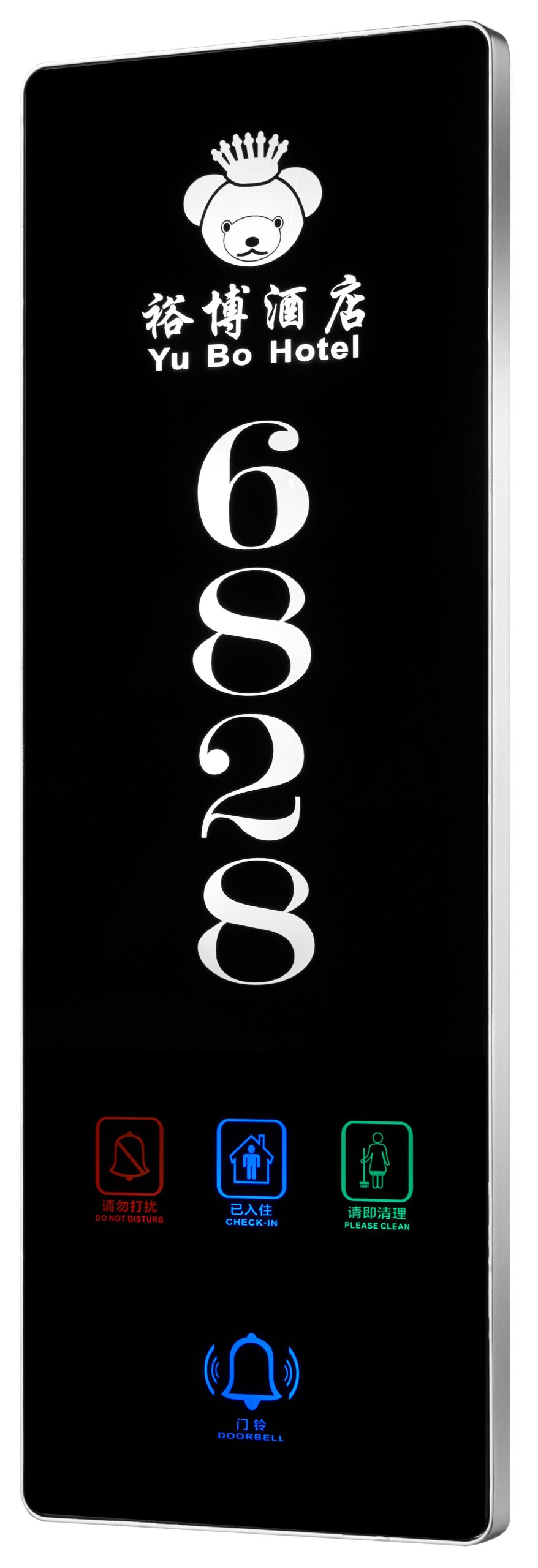 The electronic doorplate is a blend of innovation and elegance, designed to enhance the guest experience. Featuring a sleek, black facade with illuminated icons and numbers, it provides intuitive communication options. Guests can request services at the touch of a button, while housekeeping is promptly alerted. This modern doorplate not only streamlines hotel operations but also adds a touch of sophistication to every room.